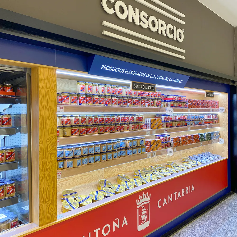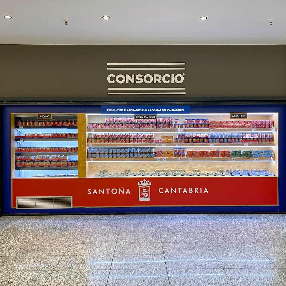 Diseñamos un corner de marca para conseguir una exhibición atractiva de sus productos de anchoa, bonito del norte y atún claro. Para ello, integramos en la tienda los colores corporativos de Consorcio, resaltamos su icónico escudo, rediseñado recientemente, y la localización Santoña – Cantabria, cuna de la anchoa y sede de la empresa desde 1950. Una experiencia de compra única, con un mobiliario en coherencia con la identidad de la marca, que consigue el reconocimiento de la misma, además de captar la atención del cliente.